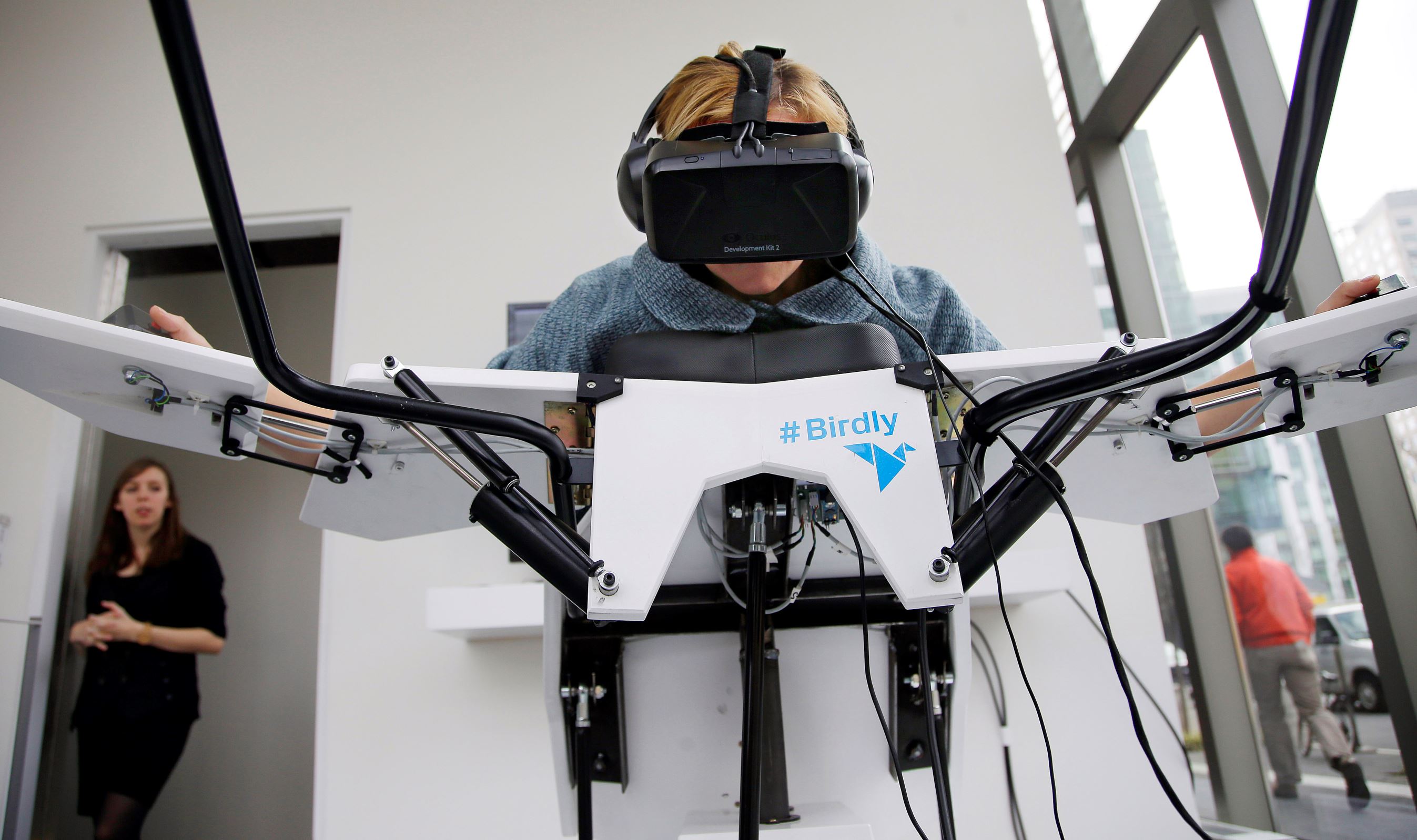 Una máquina de realidad virtual para volar llamada Birdly, en Le Laboratoire Cambridge, en Cambridge, Massachusetts, Estados Unidos. (Ver)